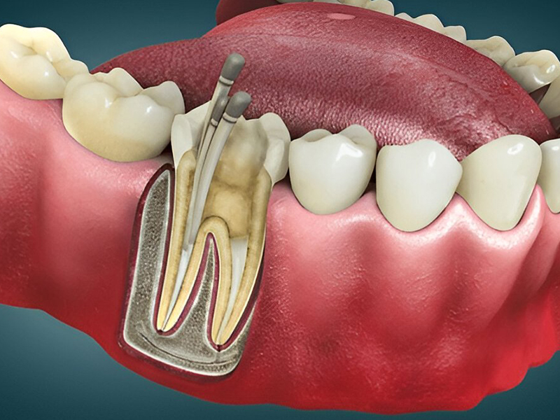The infected pulp is carefully removed, and the inside of the tooth is cleaned and disinfected.